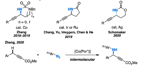 另外,有效制备这些化合物的直接策略是将氮烯炔丙基进行 C(sp3)-H 插入。然而,这些底物的化学、区域和对映选择性 C-H 胺化的控制却极具挑战性。因此开发出一种更绿色、简单、经济的方法来合成炔丙基胺化合物是很有必要的。
