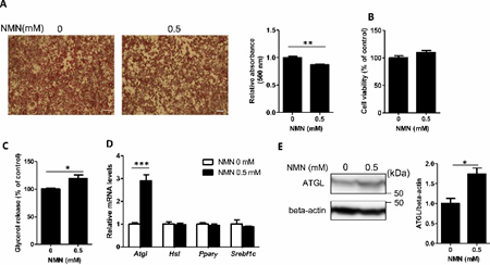 研究团队为了确定NMN对脂肪细胞中脂质储存的影响,用NMN处理分化的3T3-L1脂肪细胞,发现用0.5mM NMN处理四天可显著减少分化的3T3-L1脂肪细胞中的脂质积累。为了确定NMN调节脂肪分解的机制,研究团队检查了与脂肪分解相关的基因表达,发现NMN 通过增加3T3-L1脂肪细胞中的ATGL表达来加速脂肪分解。